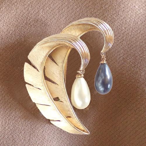 アメリカのコスチュームジュエリーメーカー、トリファリが製作したヴィンテージブローチ ブラックとホワイトのパールがシック2枚の葉っぱは光沢のあるゴールド、艶消しゴールドになっていて、先にはティアドロップ型のホワイトとブラックのパールがあしらわれています。 パール部分に小傷がありますが、それ以外はきれいなコンディション。 裏側にはTRIFARIの刻印が確認できます。 動くとパール部分が揺れて、シックな印象のブローチです。 ▶ 商品詳細★サイズ:4.5cm×5cm ★重さ: 20g ※10円玉1枚5g ★素材: プラスチック、合金 ★サイン:TRIFARI ▶ 詳細写真